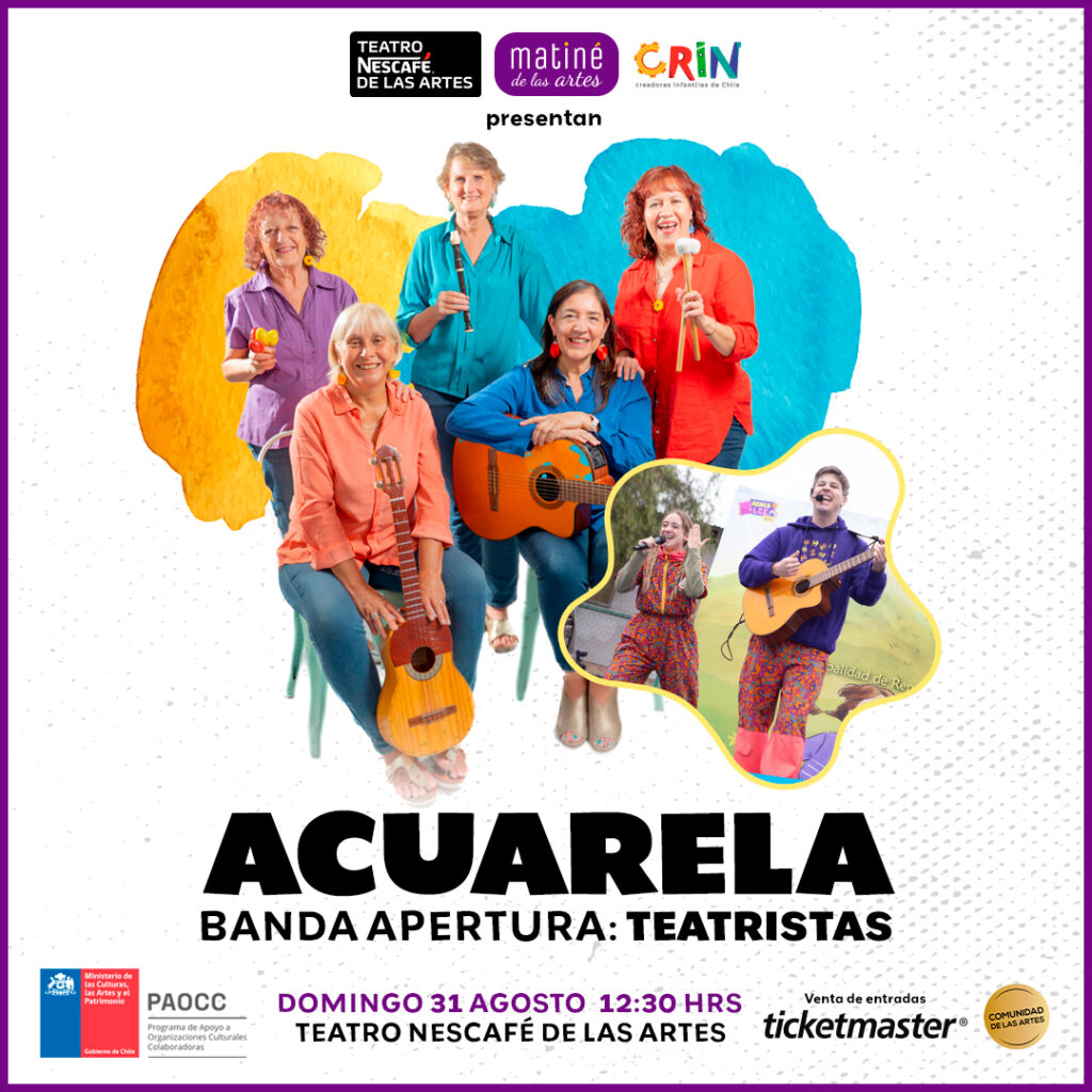 Teatro Nescafé de las Artes y la Asociación Gremial de Creadores Infantiles de Chile, CRIN Chile, presentan una nueva jornada del programa para infancias “Matiné de las Artes”. En esta ocasión, el concierto de la banda Acuarela se presentará el domingo 31 de agosto, a las 12:30 horas.