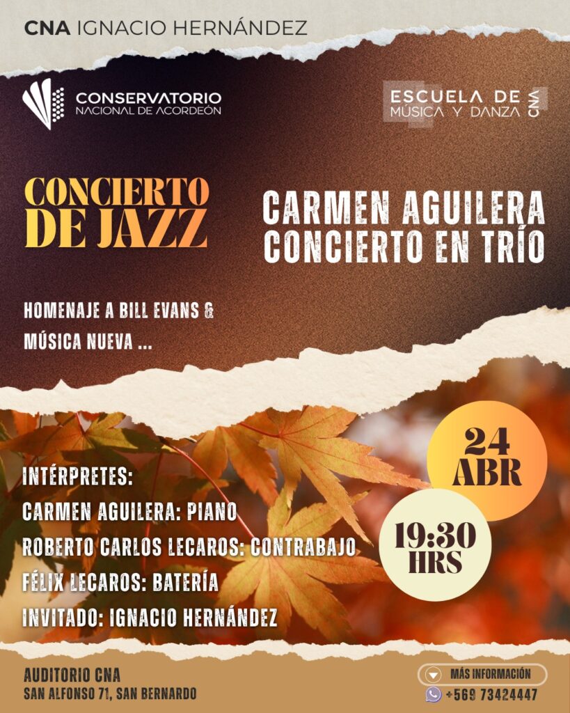 En esta ocasión, Aguilera estará acompañada por los destacados músicos Roberto Lecaros en contrabajo y Félix Lecaros en batería, conformando un trío que explorará tanto la tradición como la innovación dentro del género. El repertorio contempla un homenaje a Bill Evans, figura clave en la historia del jazz, cuya influencia sigue vigente en nuevas generaciones de intérpretes.